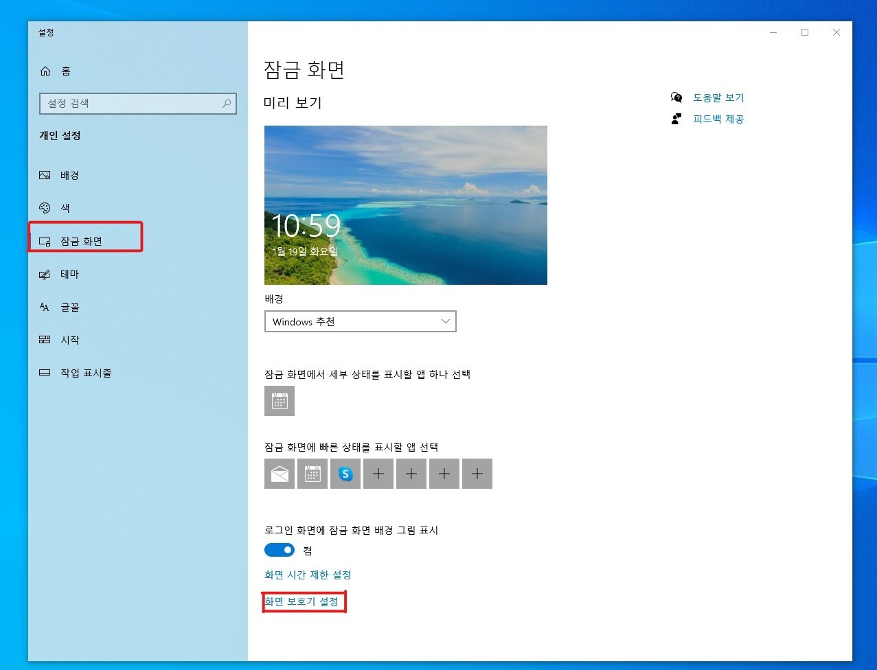 그럼 아래와 같이 창이 뜨는데 왼쪽 "개인설정" 에서 "잠금 화면" 을 클릭해주시고 중간 하단에 보이는