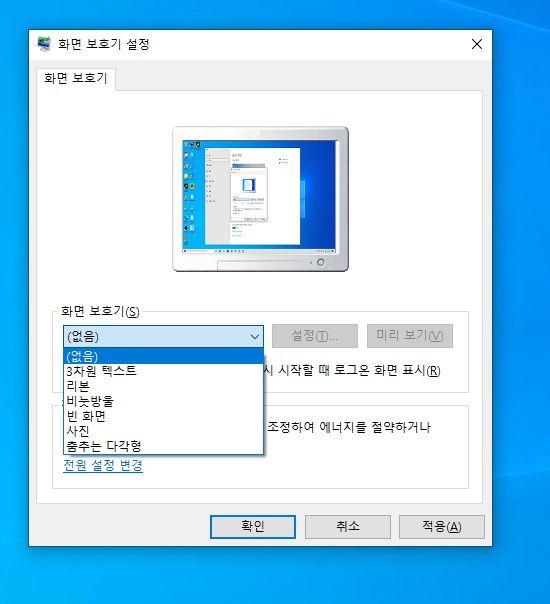 그다음 "화면 보호기" 바로 밑에 (없음) 을 클릭해주시면 "3차원 텍스트, 리본, 비눗방울, 빈화면, 사진, 춤추는 다각형"을 선택할 수 있는 항목이 나오실텐데 여기에서 하나씩 클릭해보시고 맘에 드는 화면을 골라주시면 되겠습니다.