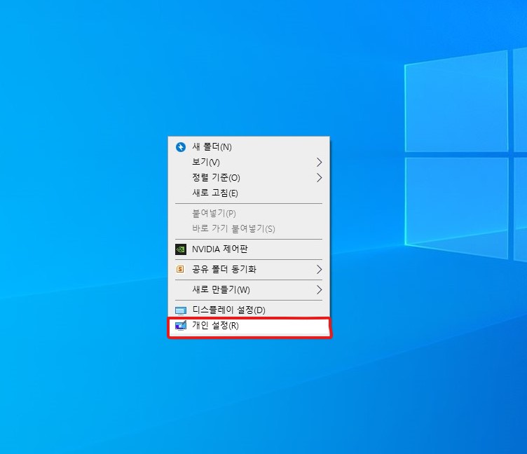 설정하는 방법에 대해 알려드리겠습니다. 바탕화면에서 마우스 우클릭을 하여 개인설정(R) 을 눌러주세여.
